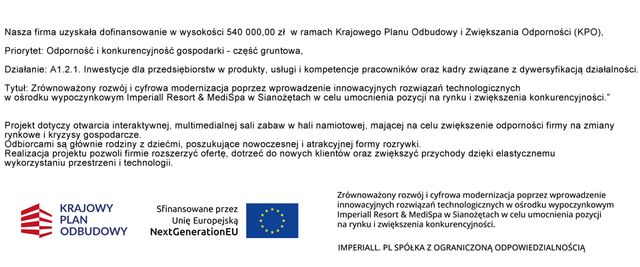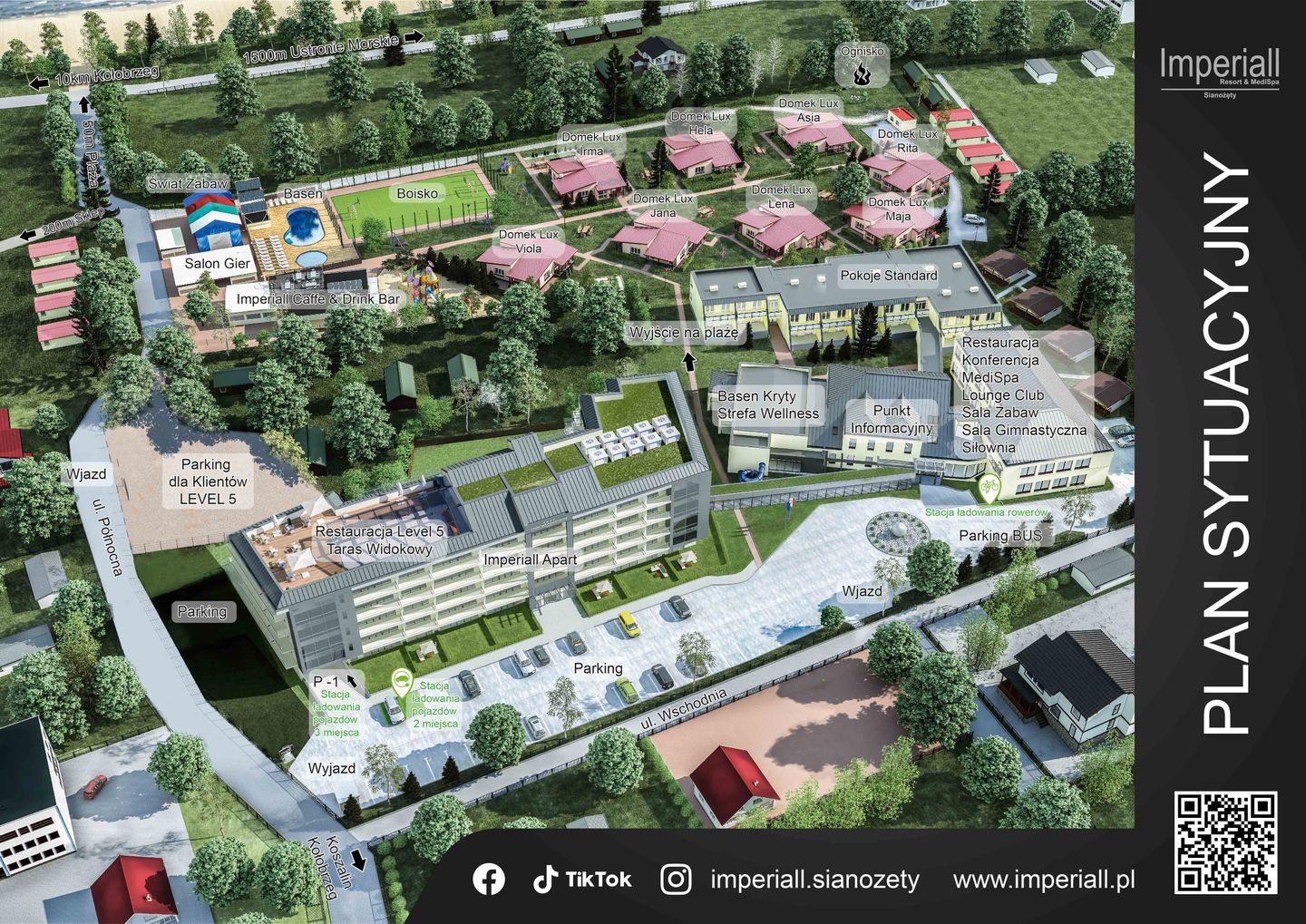 Imperiall Resort & MediSpa ist ein Badeort mit Pool, 100 m von einem breiten Sandstrand entfernt. Sianożęty — Ustronie Morskie ist eine der schönsten und saubersten Ecken der Küste, die Entspannung am Meer bietet. Auf dem Gelände befindet sich ein Komplex mit einer Fläche von über 3000 m2, zu dem unter anderem ein innovatives Hallenbad mit Rutsche und separater Kinderzone, ein geräumiges Restaurant, Konferenzräume, ein Wellnessbereich, ein Spa- und Rehabilitationszentrum, ein Kinderspielzimmer, ein Nachtclub, ein Fitnessstudio und ein Fitnessstudio gehören. Das Ganze ist mit komfortablen Zimmern für 2, 3, 4 Personen Standard und Standard Plus kombiniert. Darüber hinaus bieten wir Unterkünfte am Meer, wie zum Beispiel voll ausgestattete, ganzjährig geöffnete Lux Cottages mit Klimaanlage und Küchenzeile. Die Anlage ist speziell für Familienurlaube, Ferien mit Kindern, Kur- und Rehabilitationsaufenthalte, aktive Erholung, Seniorenurlaube, Konferenzen am Meer und Integrationsveranstaltungen für Unternehmen vorbereitet. Auf der eingezäunten und begrünten Fläche von 2,4 h befindet sich ein Komplex aus beheizten Außenpools, Whirlpool, Fahrradverleih, modernem Multifunktionsplatz mit künstlicher Oberfläche, der für Basketball, Fußball, Volleyball und Tennisplatz geeignet ist. Für Gäste, die sich entspannen möchten, bieten wir einen Wellnessbereich mit finnischer Sauna, Dampfbad, Soletetanus und Whirlpool. Freundlicher Service, hervorragende Hausmannskost und eine unvergessliche Atmosphäre ermöglichen es Ihnen, besondere Momente am Meer in Sianożęty — Ustronie Morskie zu erleben.
